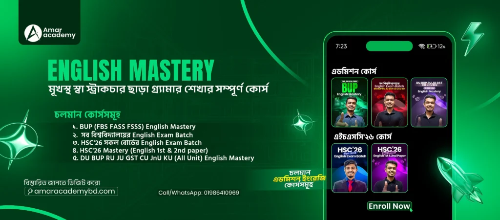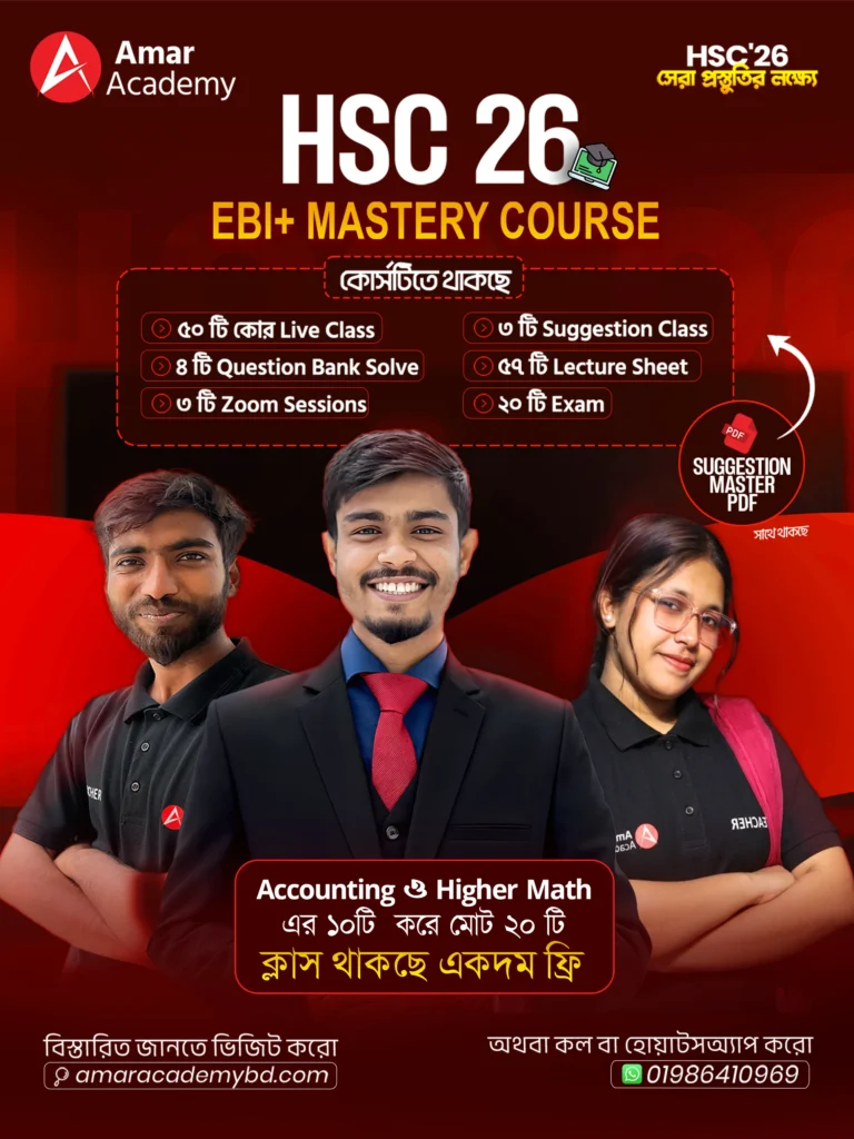 Amar Academy শিক্ষার্থীদের জন্য একটি গঠনমূলক, ধারাবাহিক ও প্রযুক্তিনির্ভর শিক্ষার নিশ্চয়তা দেয়। প্রতিদিন লাইভ ক্লাস, লেকচার শিট, প্র্যাকটিস সেট ও মডেল টেস্ট এর মাধ্যমে প্রস্তুতিকে করে তোলে সুসংগঠিত ও ফলপ্রসূ। এখানে প্রতিটি শিক্ষার্থী পায় বিষয়ভিত্তিক দিকনির্দেশনা, অধ্যায়ভিত্তিক মূল্যায়ন এবং আত্মবিশ্বাস গড়ার একটি পূর্ণাঙ্গ সহায়ক পরিবেশ। শহর বা গ্রাম — যেখানেই থাকুক না কেন, Amar Academy সকলের জন্য সমানমানের শিক্ষা পৌঁছে দেয়। এই কারণেই Amar Academy শিক্ষার্থীদের সফলতার নির্ভরযোগ্য সঙ্গী।