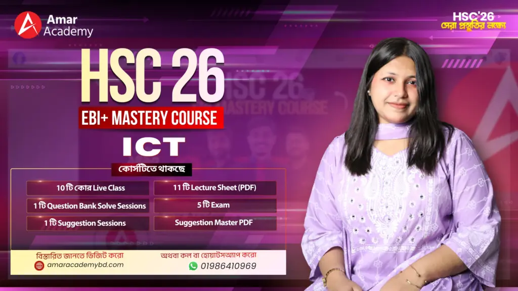 HSC’26 শিক্ষার্থীরা আইসিটির উপর পূর্ণ মনোযোগ দেওয়ার সময় এখনই, কারণ এই বিষয় শুধু HSC পরীক্ষার জন্য নয়, ভবিষ্যতের University Admission-এর জন্যও ভীষণ গুরুত্বপূর্ণ। এই অল্প সময়ে সম্পূর্ণ প্রস্তুতি নিশ্চিত করতে Amar Academy নিয়ে এসেছে HSC’26 ICT Mastery Course এই একটি কোর্সেই থাকছে লাইভ ক্লাস, টপিকভিত্তিক লেকচার শিট, নিয়মিত এক্সাম এবং Suggestion Master PDF-এর মাধ্যমে মুখস্থ নয়, বরং বুঝে শেখার ও পরীক্ষায় সঠিকভাবে উত্তর করার একটি সম্পূর্ণ গাইডলাইন।